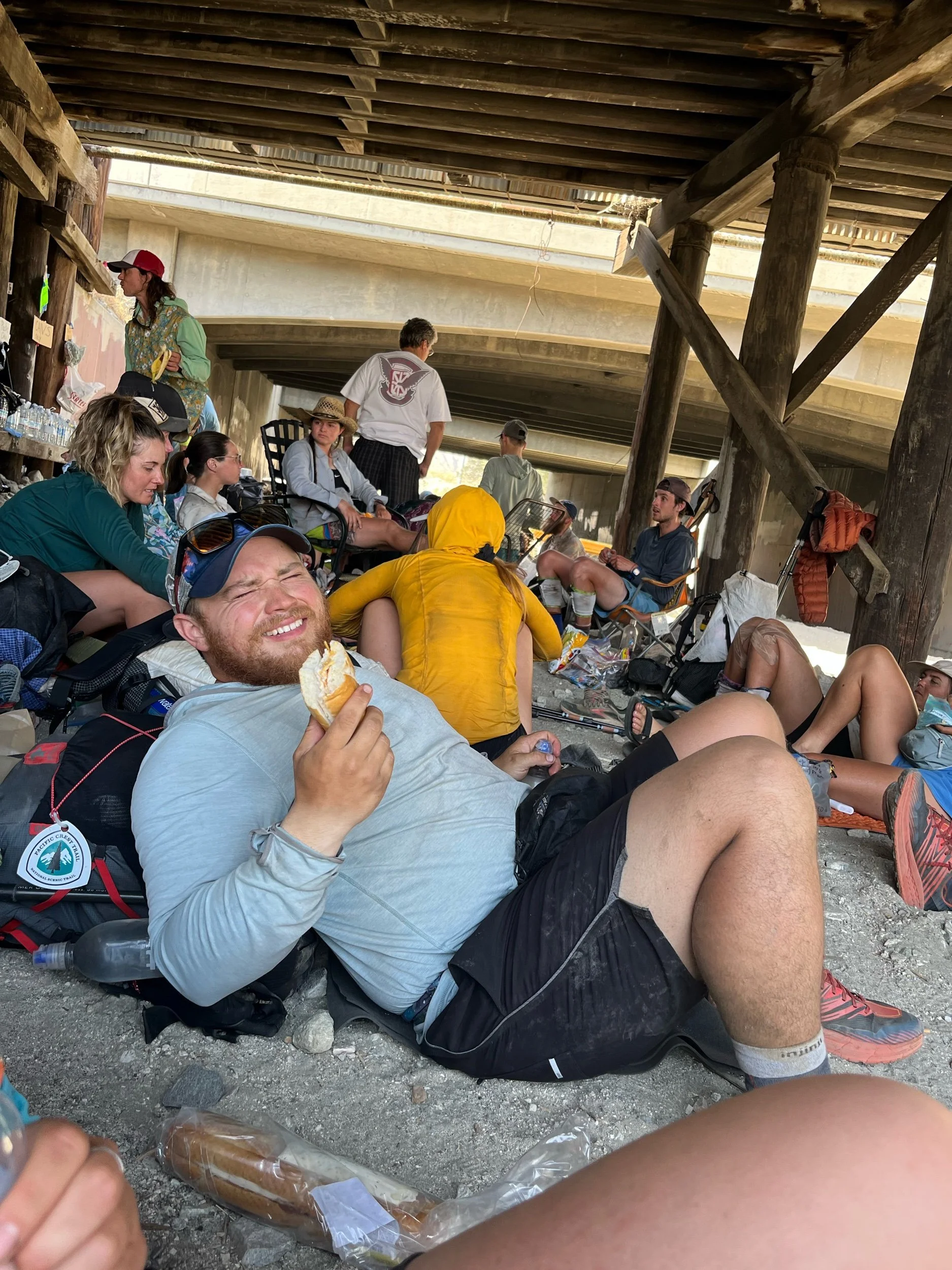 Powered on by trail magic, we crossed an awful sandy wash that was super windy sandy and hard to walk through. After trudging for an eternity, we arrived at the I-10 underpass in all its trail magic glory! There were gatorades, oranges, other goodies, cardboard signs to write your name, and lots and lots of shade, under which many hikers were taking respite.